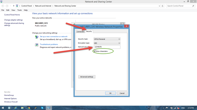 تبديل علامة التبويب إلى "الأمن" وبالتخلص من مربع قبل "تظهر الحروف"، ثم سترى يتم عرض كلمة المرور. يمكنك كتابة كلمة المرور لتسجيل ذلك. انقر على زر "موافق" وإغلاق "مركز الشبكة والمشاركة" لإنهاء العملية.