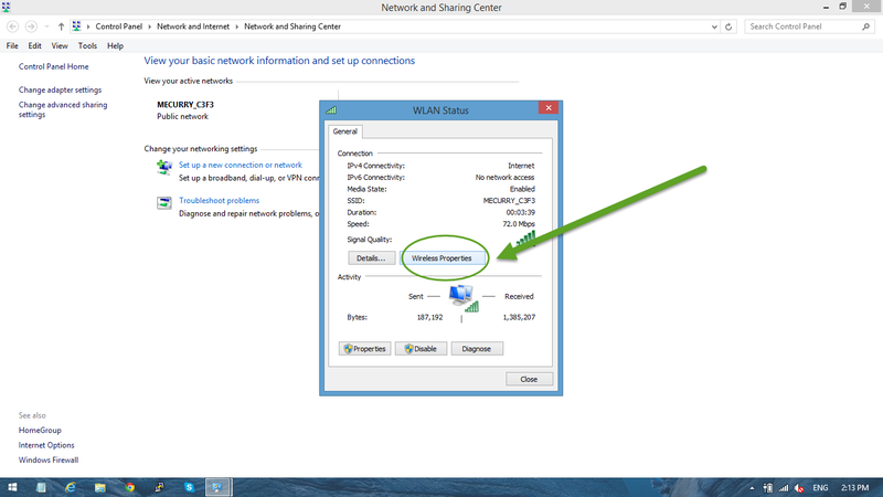 سيتم فتح نافذة حالة الاتصال الخاصة بك. العثور على زر "خصائص اللاسلكي" واضغط عليها.